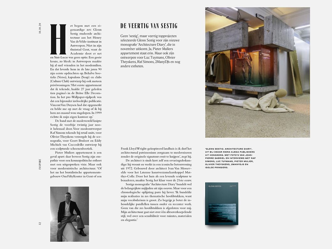 | It is with great pleasure that we announce the launch of Glenn Sestig Architecture Diary this month by Oscar Riera Ojeda Publishers. The new monograph offers an immersive tour of some 40 projects from our studio and is the culmination of over twenty years of practice for Glenn Sestig Architects, spanning residential, commercial and cultural architectural projects, as well as product design. “In the architecture world, where often egos joust for attention in the international scene and statement buildings dominate headlines, Glenn Sestig is the refreshing embodiment of the quiet virtuoso,” writes one of the publication’s contributors and wallpaper* architecture editor Ellie Stathaki. “His approach favours subtle spatial luxury, calm, clean forms, material honesty and Minimalist and Modernist influences - all elements that have come to define his professional path and hefty creative portfolio, which balances perfectly the tightrope between function and art. It’s no surprise that illustrious clients, such as fashion designer Raf Simons and artist Luc Tuymans, flock to his studio with their commissions.” oro publishers. architecture diary | | | | | | Antwerp’s Riverside Tower, designed by Léon Stynen and Paul De Meyer in 1968, is a modernist classic and a local landmark. Nestled at its top is a brutalist villa-in-the-sky, the home of fashion designers and life partners Pieter Mulier and Matthieu Blazy - a penthouse previously belonging to De Meyer himself. Belgium’s Sabato Magazine delves into the details of this elegant architectural transformation, which aimed at opening up the interior, while preserving the original architecture’s intention. Now, dramatic, long, uninterrupted glazing frames the views; the newly redesigned, generous one-bedroom apartment includes a studio space and a guest suite; ramps unite all levels to future proof the home; concrete and travertine stone dominate the interiors; grown trees and bespoke, built-in concrete furniture feature in the terraces, landscaped by Wirtz International. sabato magazine | | | | | | The extensive article also highlights this month’s publication of Glenn Sestig Architecture Diary by Oscar Piera Ojeda Publishers. The luxurious tome features beautiful photography, and insightful drawings and sketches. Works are put into context and further enhanced by a foreword by creative director and luxury goods specialist Nick Vinson; an introduction and project descriptions by wallpaper* architecture editor Ellie Stathaki; an architectural essay by architect, author and curator Vladimir Belogolovsky; and interviews with a range of clients, including fashion designer Pieter Mulier and musicians 2ManyDJ’s, by designer and curator Clémande Burgevin Blachman. | | | | Glenn Sestig Architecture Diary features within Elle Decor Italia’s special edit of this year’s 30 most beautiful books. Publications span works from the fields of design, architecture, interiors, art, fashion and food. Yes, the selection is varied, explains the editorial team, but there is a strong, common thread running through those included: “above all, the love of beauty, the desire to refine tastes and passions, the constant search for creative trajectories, no matter how far from conventional paths.”